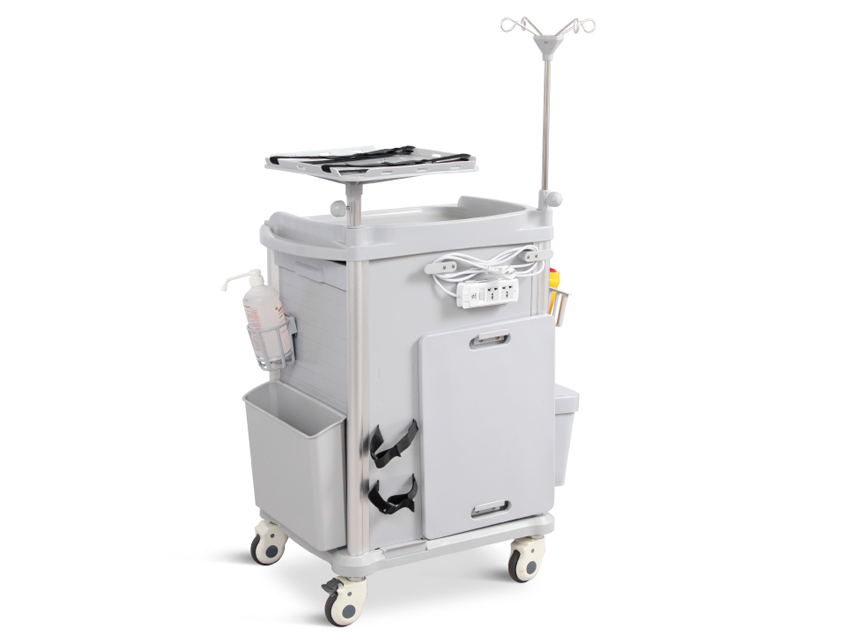 CARRELLO EMERGENZA NEO PLUSCarrello di emergenza in ABS e in materiale antibatterico all’esterno, mentre la struttura interna è in acciaio e alluminio. Dotato