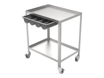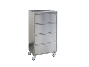 CARRELLO PORTASTRUMENTIStruttura monoblocco in acciaio satinato AISI 304. Dotato di 4 cassetti scorrevoli su guide (misure interne 49x33xh 18 cm), il primo pro