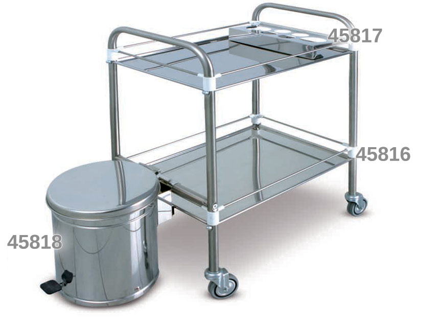CARRELLO REXCarrello medicazione completo in acciaio inox. Fornito con 3 ripiani, cestino rifiuti, cassetto, portabottiglie, spondine sui due ripiani inferiori
