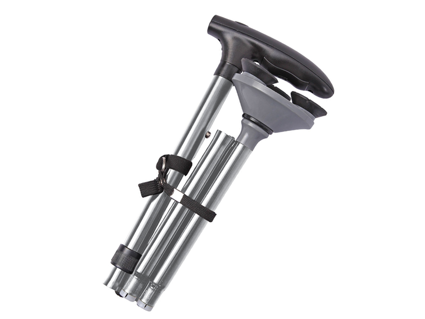 TRUSTY CANE - argentoBastone robusto e pieghevole dotato di luce e base ad ampia rotazione con 3 piedini stabili antiscivolo.Altezza regolabile 85-97 cm. Ampia base Ø 9 cm.As