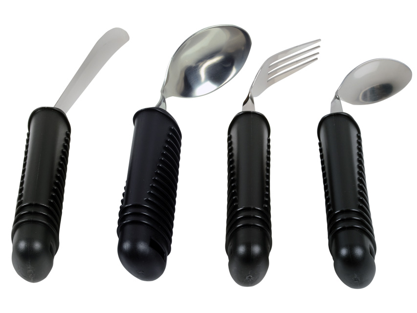 SET POSATE MODELLABILISet composto da 4 posate in acciaio inox (coltello, forchetta, cucchiaio e cucchiaino) e con impugnatura in gomma striata lunga 11 cm per facilitare la