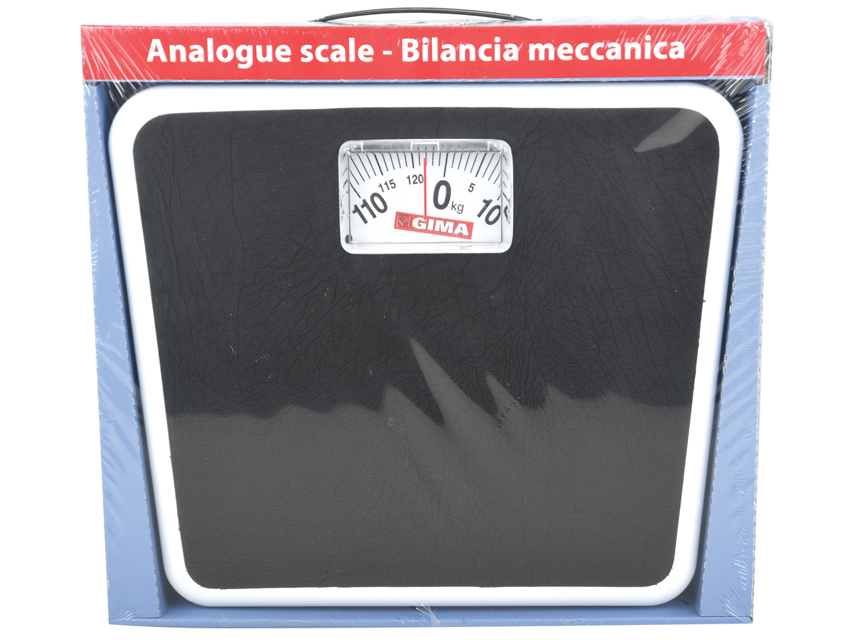Bilancia da bagno analogica particolarmente stabile con rivestimento in plastica.Scatola e manuale in 18 lingue: GB, FR, IT, ES, PT, DE, GR, HR, HU, SI, RO, EE