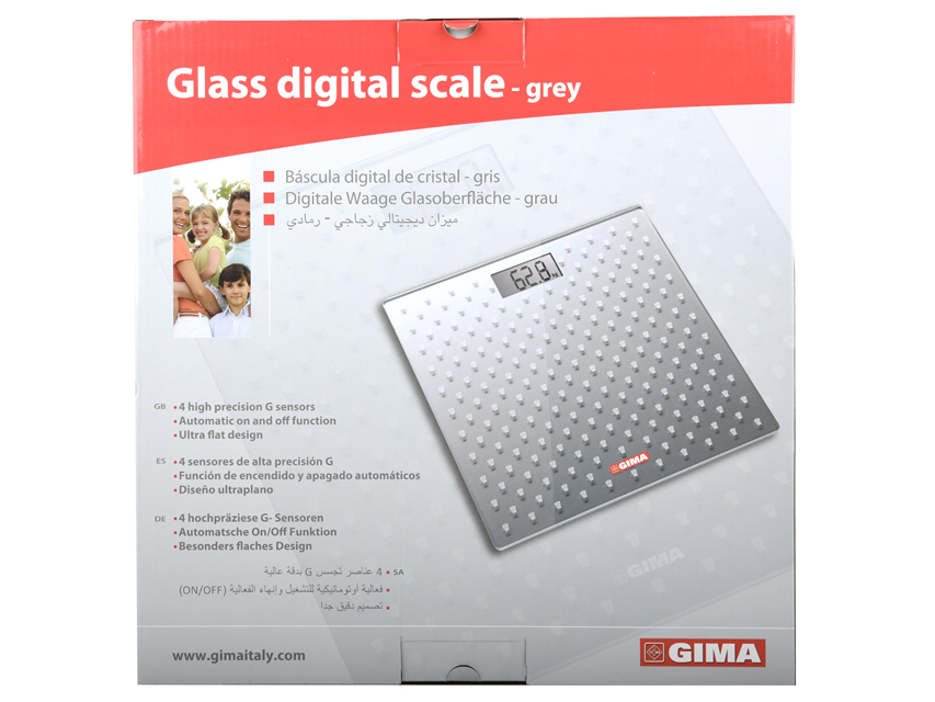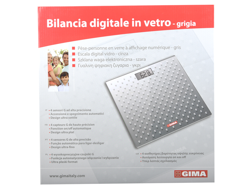 BILANCIA DIGITALE IN VETRO - grigiaBilancia da bagno elettronica con pedana in vetro temperato di 6 mm di spessore.Ultrasottile: è alta solo 19 mm.4 sensori G