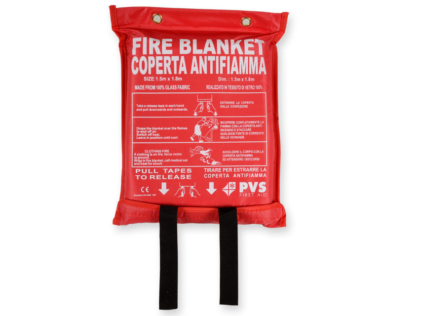 COPERTA ANTIFIAMMAIn fibra di vetro,utilizzabile per estinguere fiamme di bassa intensità.Dimensioni: 150x180 cmStandard EN1869 1997.