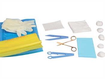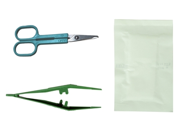 Contenuto del kit:TelinoPinza chirurgicaPorta aghiPinza anatomicaPinza ad anelliMorsetto Styptic (pinza Kelly)Forbici retteCompresse di garza 7,5 x 7,5 cm 8 st