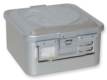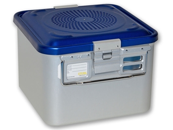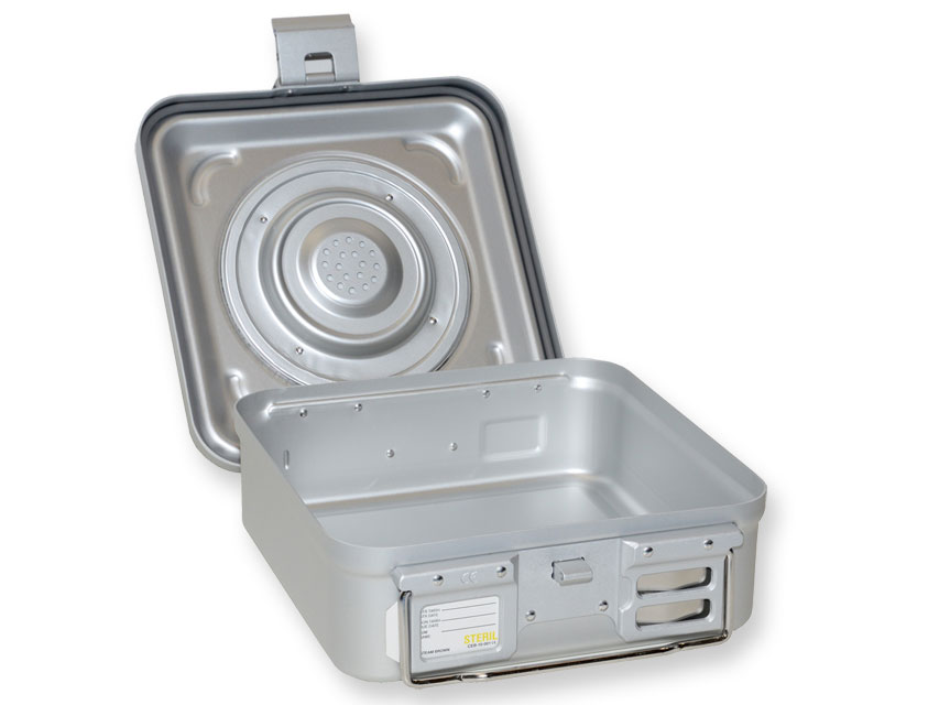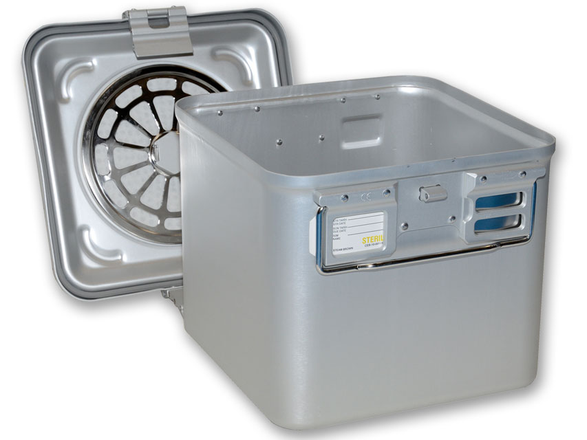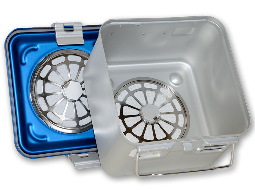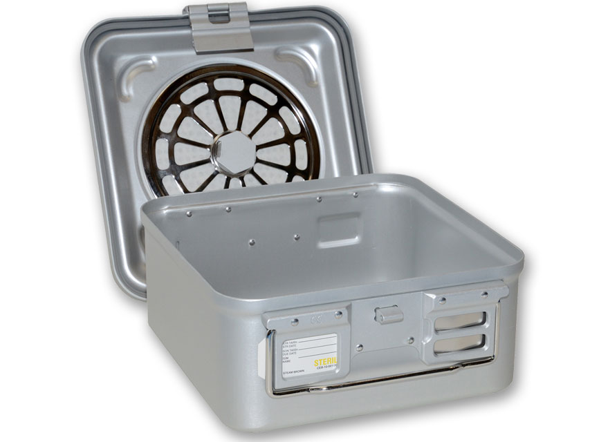 Container standard con due filtri e fondo perforato: il fondo perforato velocizza il processo di sterilizzazione (circa la metà del tempo rispetto un fondo non