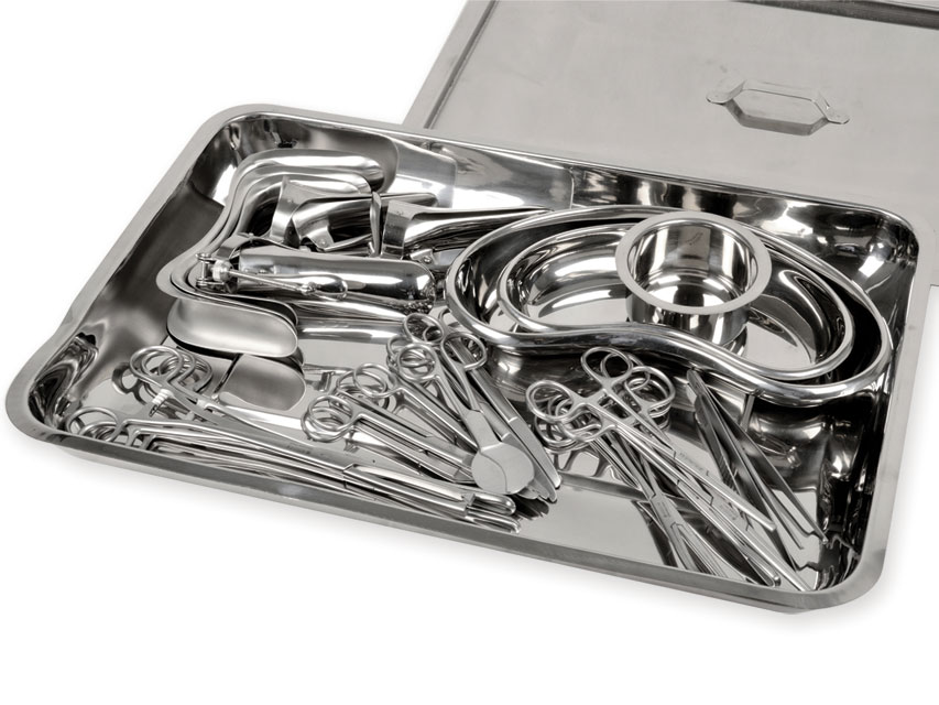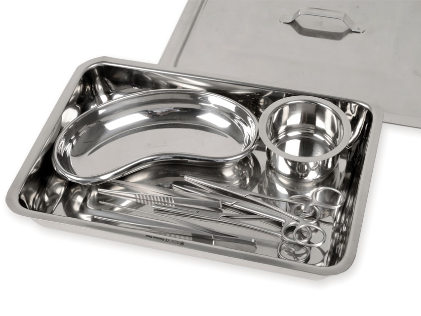 Set sutura, 12 pezzi.Contenuto del set:- Bacinella reniforme 20 cm - media- Catino 150 ml - medio- Porta aghi Mayo Hegar - 18 cm- Pinza Kocher - retta - 16 cm-