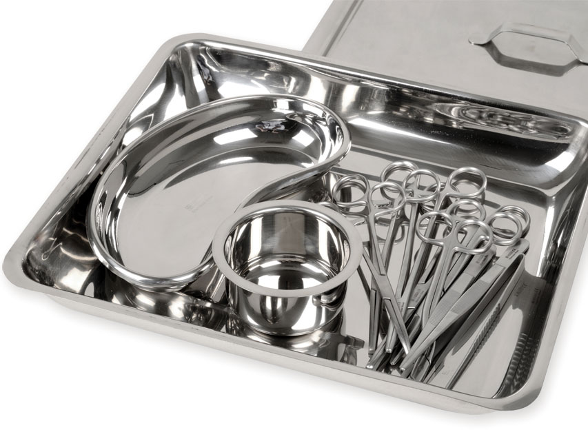 Set medicazione, 8 pezzi.Contenuto del set:- Bacinella reniforme 20 cm - media- Catino 150 ml - medio- Pinza Kocher - retta - 16 cm- Pinza per bende (Thumb) -