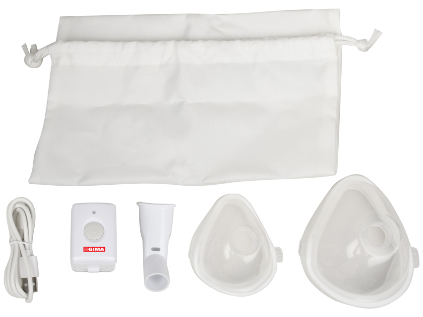Fornito con mascherina per adulti, mascherina pediatrica, boccaglio per inalazione, batteria integrata, cavo di tipo C e manuale multilingue GB, FR, IT, ES, PT, DE, DK, RO, HR, GR.