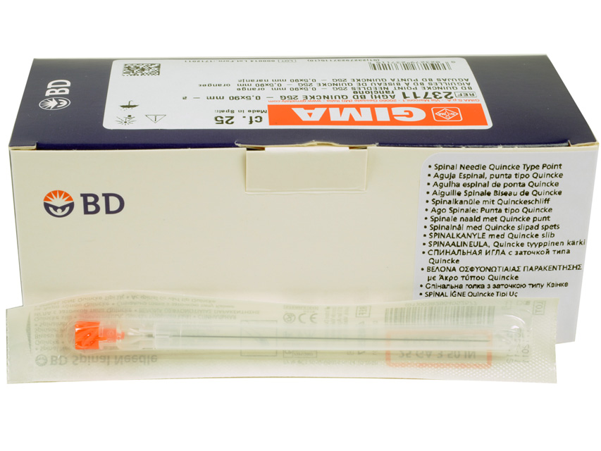 AGO PER ANESTESIA SPINALE BD CON PUNTA QUINCKE – STERILE• Codice BD: 405257• 25G 3.50 IN 0,5×90 mm – arancioneAghi per anestesia spinale BD con punta Quincke;