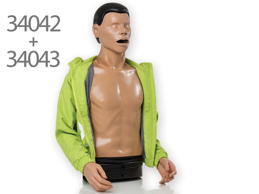 L’Ambu Airway man include un torso con ganci per braccia e viene fornito con giacca della tuta, materassino per l’addestramento e borsa per il trasporto.