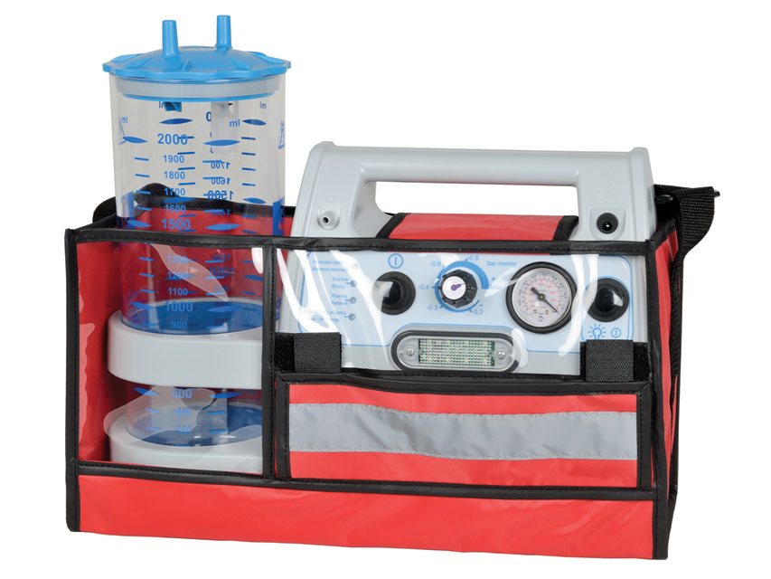 Aspiratore portatile professionale ad alto flusso-alto vuoto, funziona con alimentazione a 12V, con batterie ricaricabili incorporate o direttamente da rete elettrica (funzionamento continuo 110-230 V) durante la ricarica delle batterie.