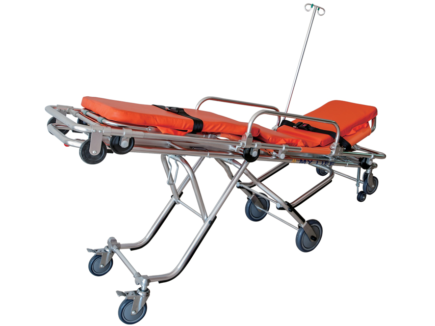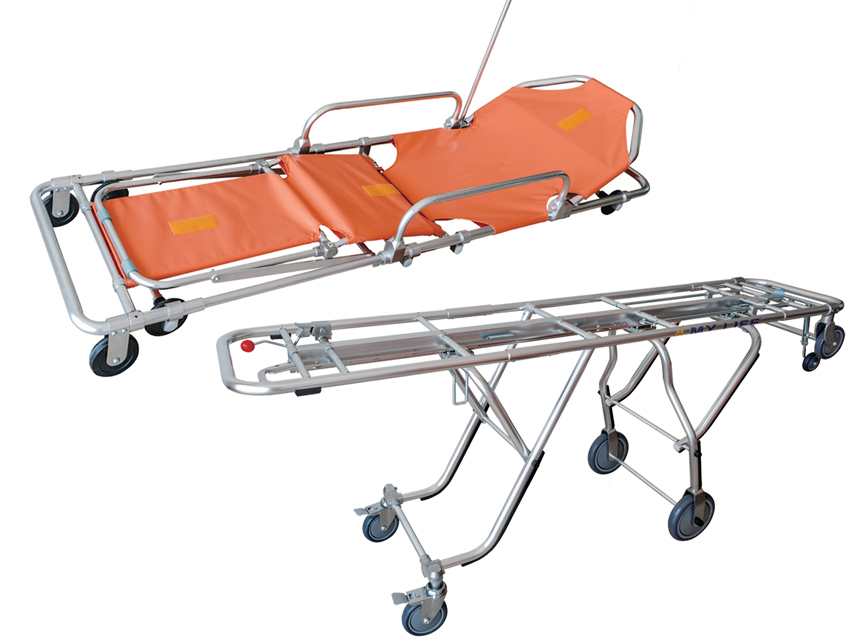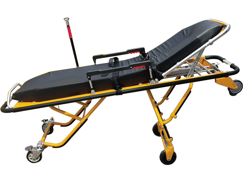 La parte superiore può diventare una sedia a rotelle. La barella è regolabile a 6 livelli e inclinabile avanti e indietro secondo la necessità. Quando è piegata in avanti, lo schienale è sostenuto da molle pneumatiche fisse che permettono il controllo dell’inclinazione da 0 a 60 gradi.