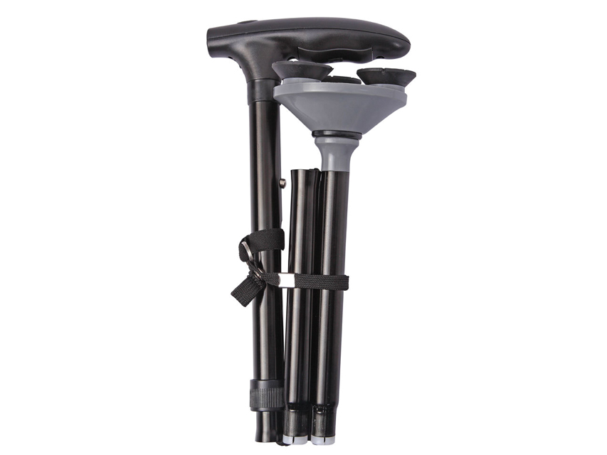 Bastone robusto e pieghevole dotato di luce e base ad ampia rotazione con 3 piedini stabili antiscivolo.