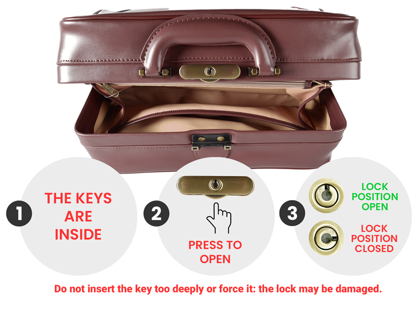 Fondo rigido, tasca interna centrale con zip, tasca interna laterale, serratura brunita.