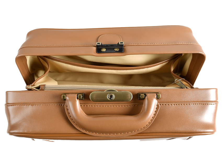 Fondo rigido, tasca interna centrale con zip, tasca interna laterale, serratura brunita.