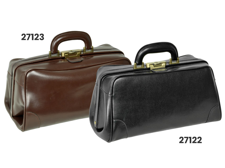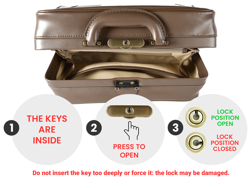 Fondo rigido, tasca interna centrale con zip, tasca interna laterale, serratura brunita.