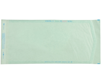 Pellicola trasparente di poliestere-polietilene verde accoppiato a carta medicale che permette la penetrazione del vapore e del gas durante la sterilizzazione. Gli indicatori di vapore e gas cambiano colore quando esposti alla sterilizzazione.