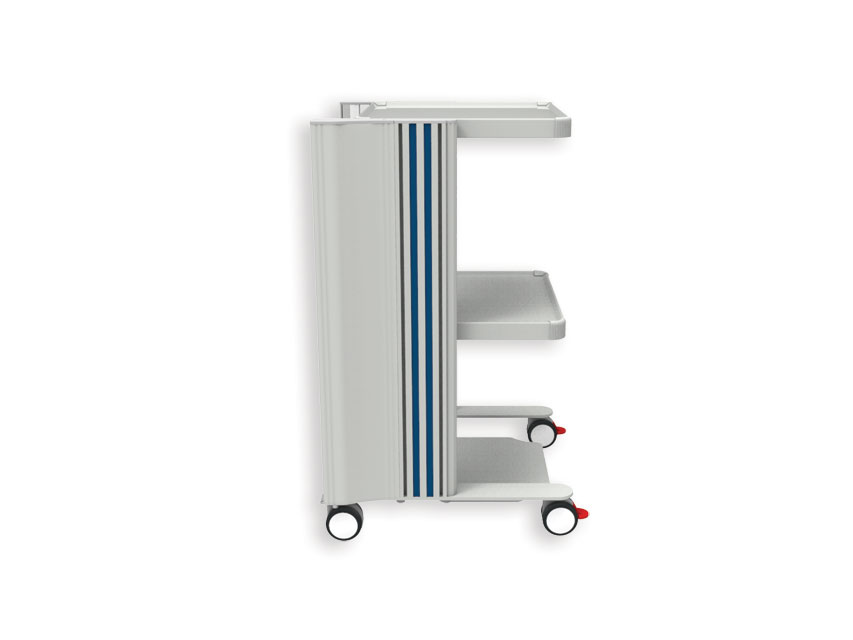 Linea completa di carrelli eleganti e resistenti con 2, 3 o 4 ripiani e prese di alimentazione. Ripiani resistenti regolabili in altezza, colonne di alluminio e 4 rotelle gemellate Ø 65 mm (2 con freno). Tutti i ripiani sono dotati di sponda anticaduta. Studiati per dispositivi medici. Istruzioni illustrate per il montaggio.