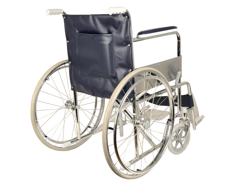CARROZZINA STANDARD – seduta 46 cm – tessuto blu- struttura a incrocio singolo- struttura cromata- braccioli fissi, imbottitura PVC- poggiapiedi fissi, pedana alzabile, cinta