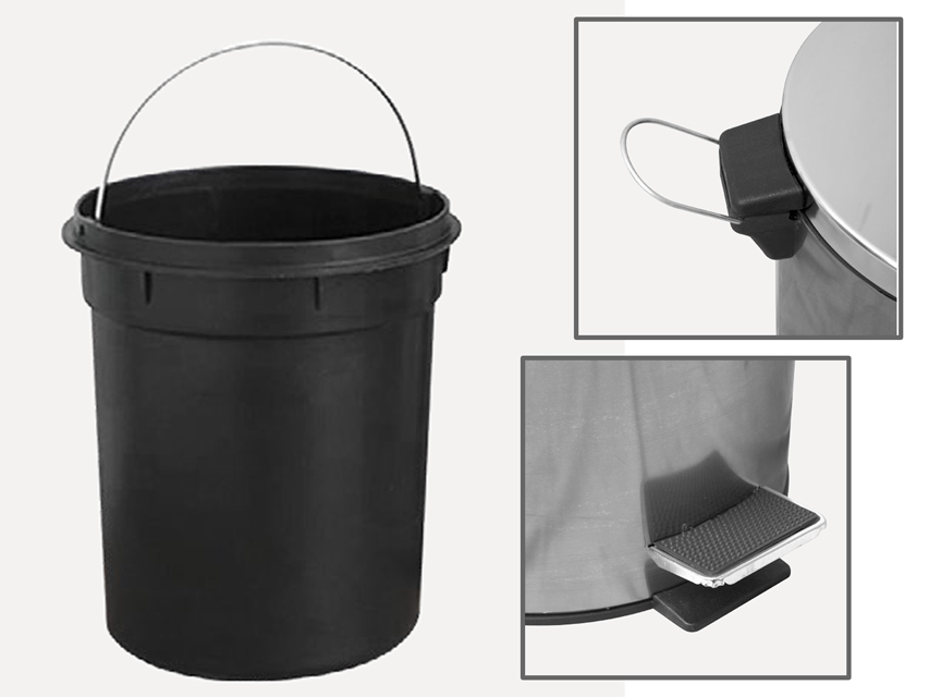 Cestini rifiuti con struttura in acciaio inossidabile di alta qualità e superficie lucidata a specchio, dotati di manico e pedale. Il secchio interno in plastica è molto resistente alla pressione, non lascia fuoriuscire i liquidi ed è facile da estrarre grazie al manico. Spessore: 0,35 mm.