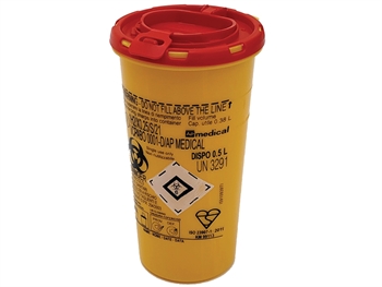 CONTENITORE RIFIUTI TAGLIENTI DISPO 0,5 l – 8,3x h 15,1 cmContenitore monouso di forma conica, resistente alle perforazioni, per smaltire rifiuti appuntiti e t