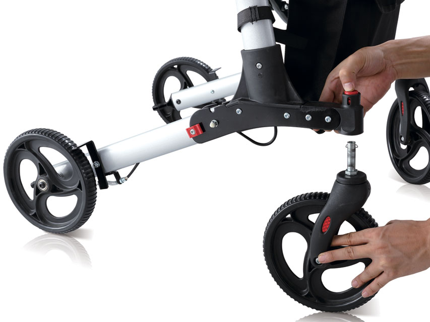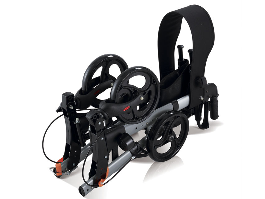 Struttura leggera in alluminio color argento, sedile imbottito in nylon con strap up. Impugnatura ergonomica e freni ad anello per una maggiore sicurezza. Cavo del freno nascosto. Porta bastone. Ruota anteriore a sgancio rapido, tubi posteriori pieghevoli senza viti per raggiungere una dimensione più compatta. Dimensione 66×73 cm. Dimensione imballo 66x29x37 cm. Manuale multilingue: GB, FR, IT, ES.
