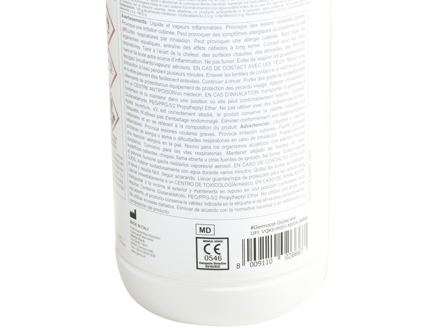 100 g di prodotto contengono: Glutaraldeide 2,0 g; O-Fenilfenolo 0,5 g; Alcol isopropilico; Coformulanti; Acqua depurata q.b. a 100,0 g.
