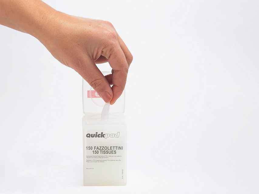 Traduttore Google DISPENSER QUICKPADFazzoletti impregnati di alcool isopropilico al 70%.Il coperchio a chiusura ermetica evita l’evaporazione.Dimensioni 50x50x80 mm.Contiene 150 fazzoletti di