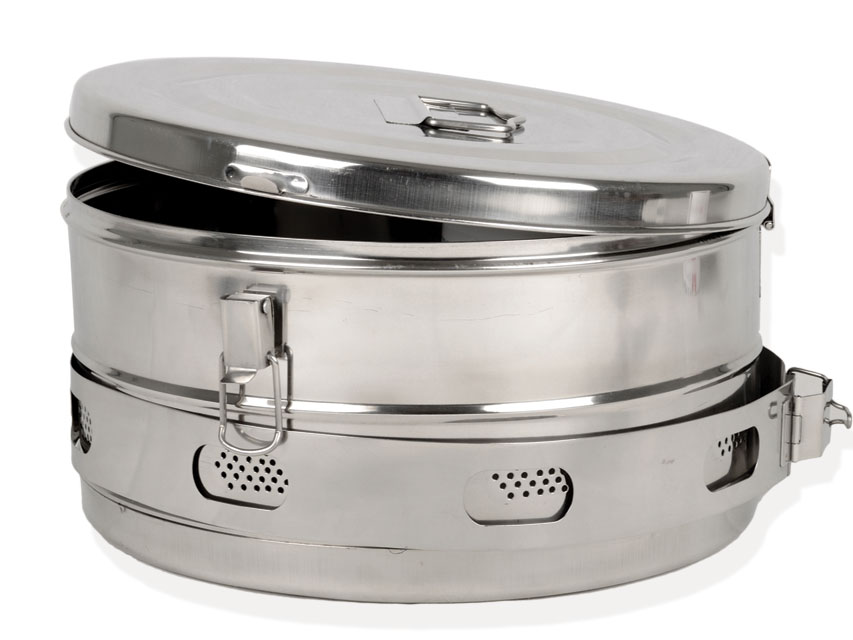 Contenitori cilindrici adatti a sterilizzare medicazioni (garze, bende di cotone, ecc.) in sterilizzatore a vapore (autoclave) o a secco.