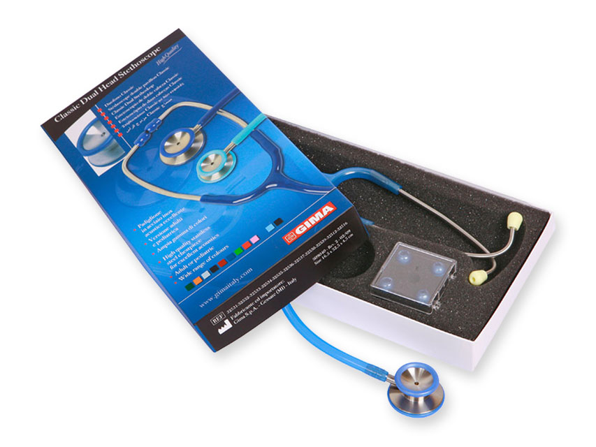 Stetoscopi di alta qualità con padiglione in acciaio inox e archetto in acciaio inox con doppia molla interna ed eleganti tubi in PVC per un’efficacia acustica superiore.
