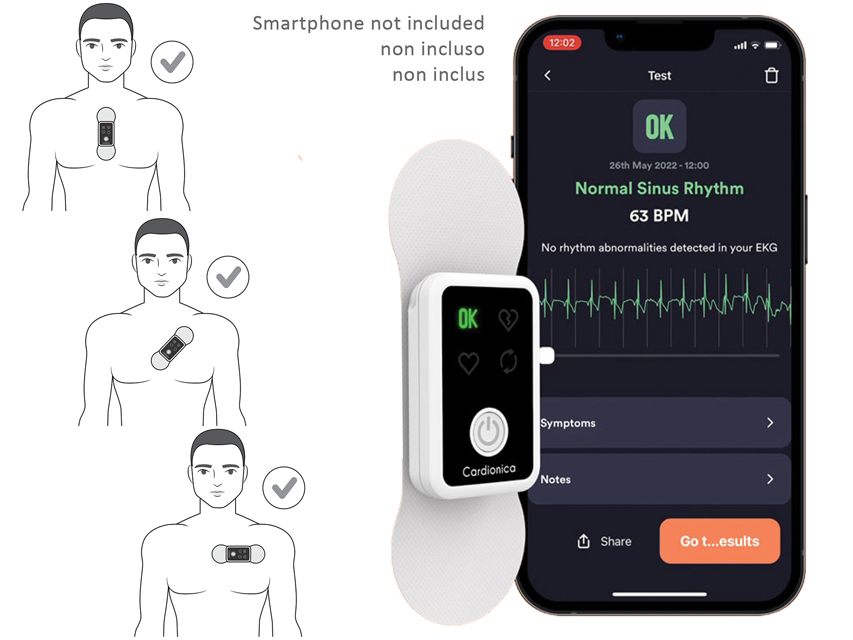 Apparecchio autonomo o utilizzabile tramite App: applicando l’elettrodo adesivo sul torace, l’apparecchio può essere usato in modalità autonoma o collegato a uno smartphone via Bluetooth.
