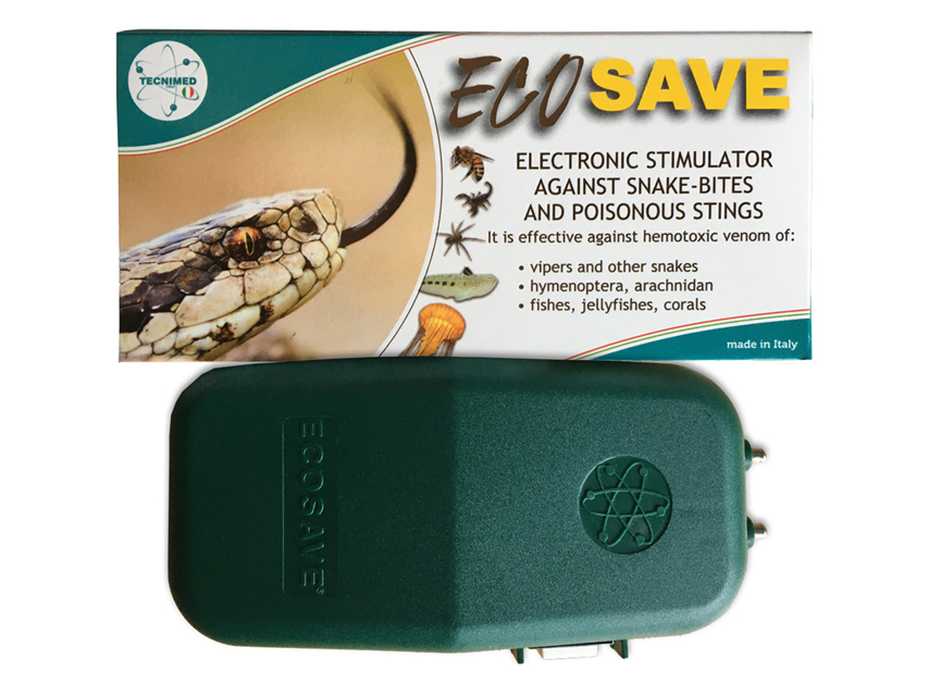 ECOSAVE CONTRO MORSI VELENOSIDispositivo elettronico tascabile che produce – mediante due elettrodi – brevi scariche (della durata di circa dieci microsecondi