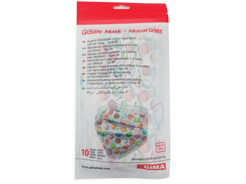 MASCHERINE FILTRANTI 98% A 3 VELI – TIPO IIR con elastici• Modello per adulti• Flowpack da 10• Fantasia: macaronesMascherine chirurgiche leggere e confortevoli