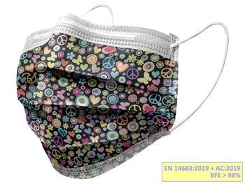 MASCHERINE FILTRANTI 98% A 3 VELI – TIPO IIR con elastici• Modello per adulti• Flowpack da 10• Fantasia: peaceMascherine chirurgiche leggere e confortevoli ada