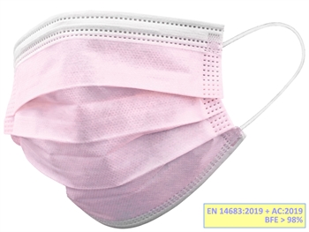 MASCHERINE FILTRANTI 98% A 3 VELI – TIPO IIR con elastici• Modello per adulti• Scatola da 50• Colore: rosaMascherine chirurgiche leggere e confortevoli adatte