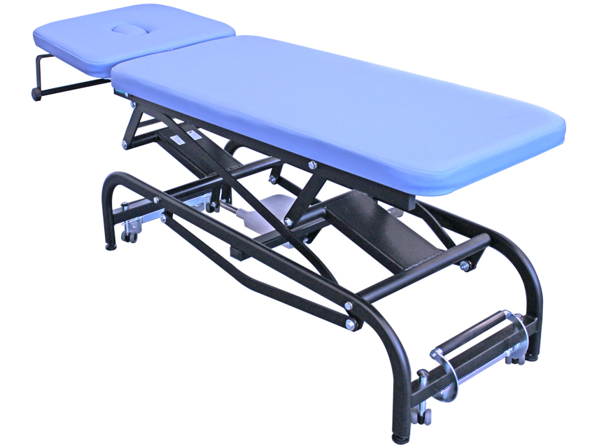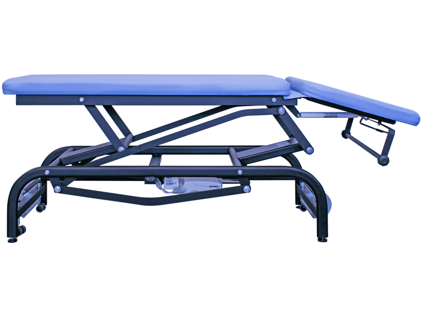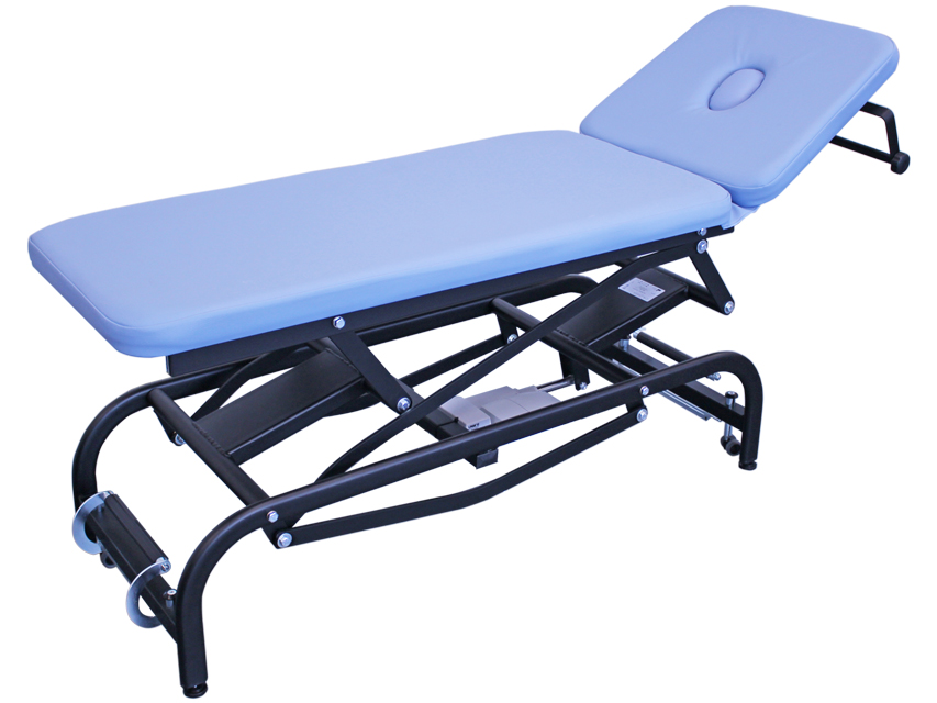 Lettino regolabile in altezza (48-95 cm) tramite attuatore elettrico (Linak 6.000 N) controllato da pedale, con testata facilmente inclinabile (da +60° a – 10°) mediante una pompa a gas.