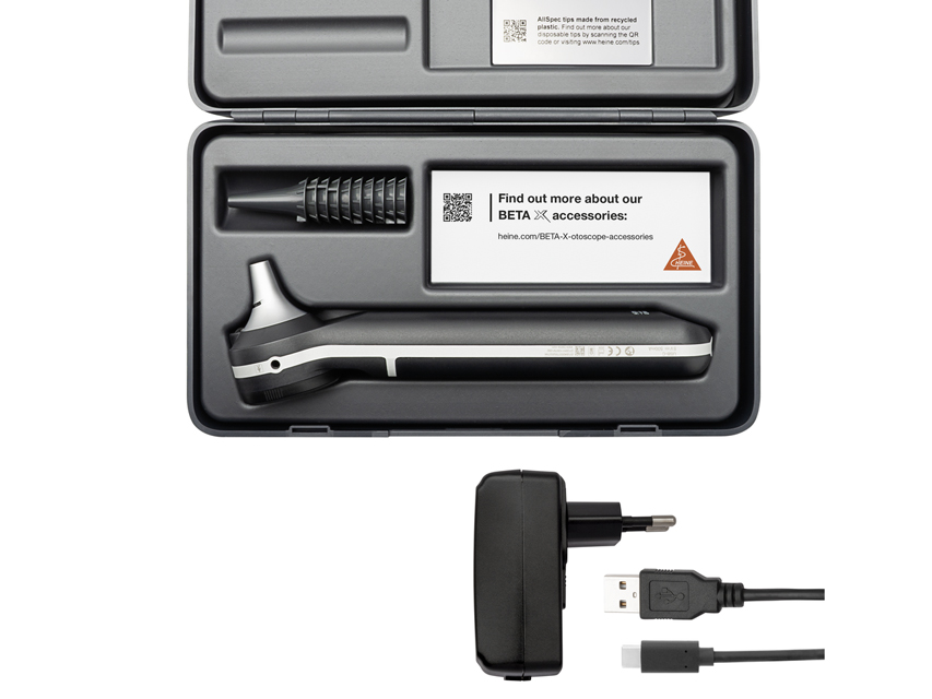 Fornito con HEINE X CHANGE System 4.2x Magnifier, 10 speculum monouso AllSpec 4 mm, cavo di alimentazione USBC, astuccio rigido e manuale multilingue GB, FR, IT, ES, PT, DE, NL, SE, DK, NO, FI.