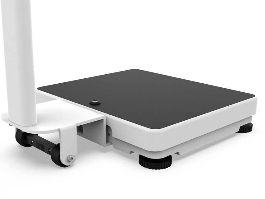 Bilance digitali professionali a colonna con base ampia e stabile in alluminio verniciato e pedana antiscivolo in metallo verniciato.
