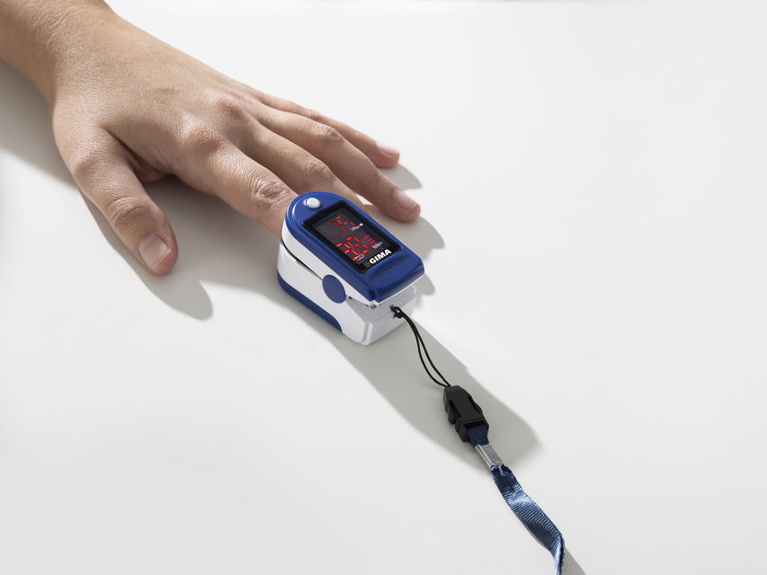 Pulsoximetro per la misurazione della saturazione di ossigeno e della frequenza cardiaca dal dito del paziente.