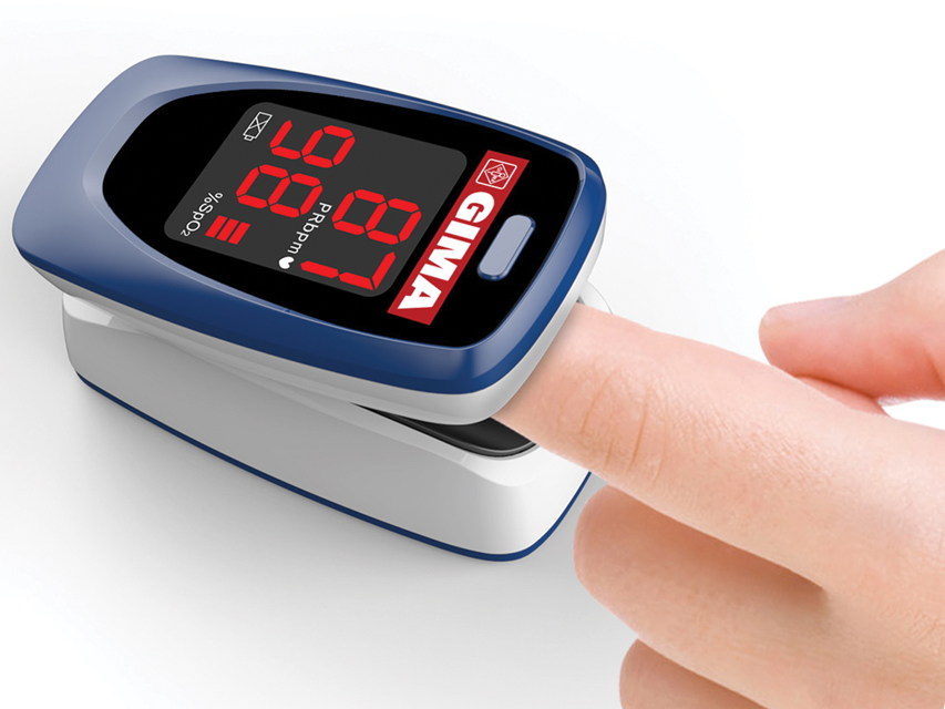 Pulsoximetro per la misurazione della saturazione di ossigeno e della frequenza cardiaca dal dito del paziente.