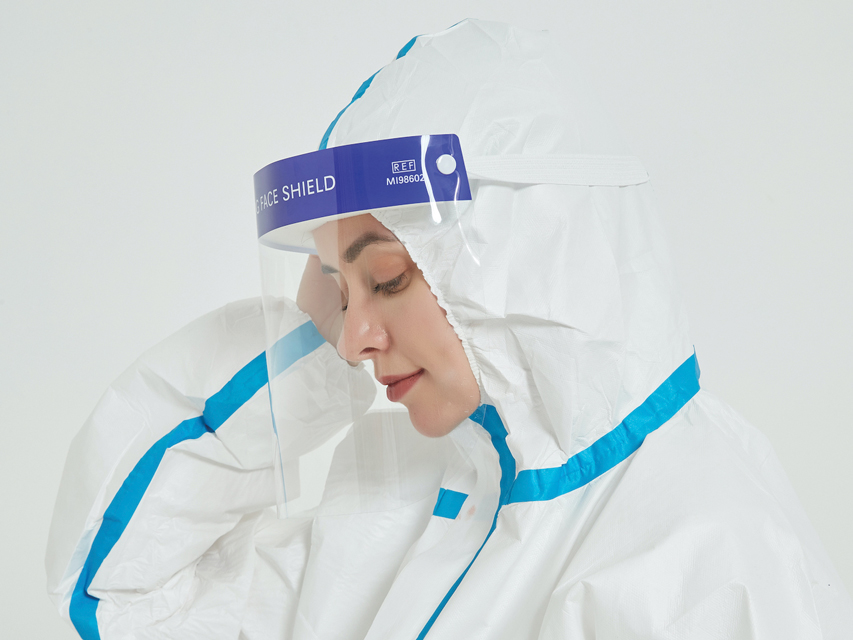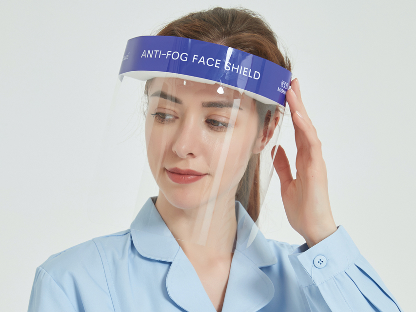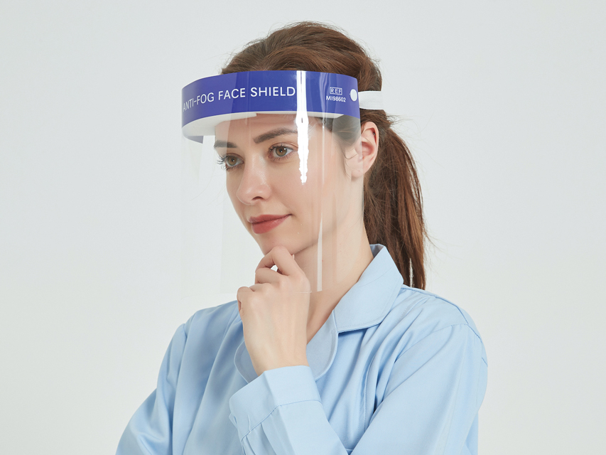 Schermo facciale protettivo monouso in pellicola idrofila antiappannante.