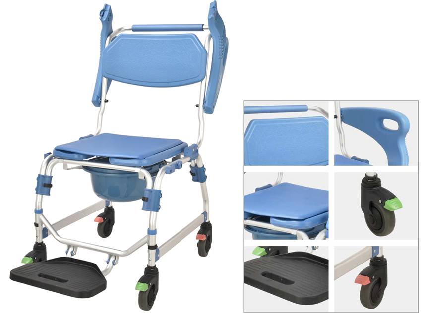 4 rotelle in plastica dotate di freni, un ampio poggiapiedi e bacinella WC con coperchio.