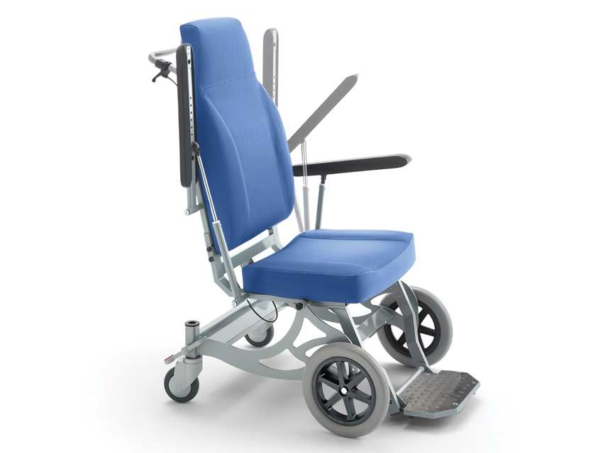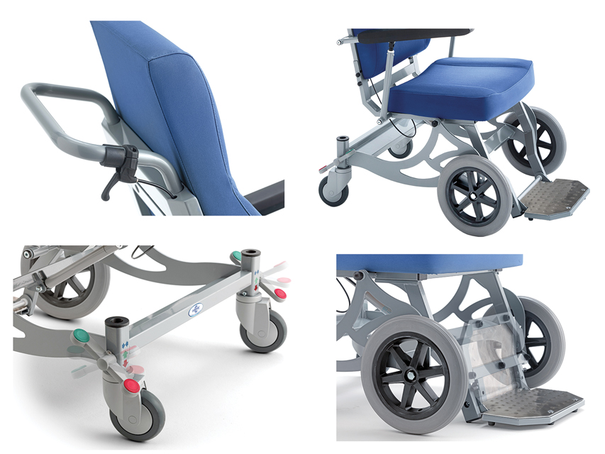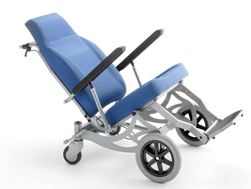 Sedia per il trasporto di pazienti all’interno di un ospedale o di una comunità; adatta per i trasferimenti in pronto soccorso o nei reparti. Idonea anche per trasferimenti esterni, per superare ostacoli o per spostarsi su terreni irregolari. Ruote anteriori solide con diametro di 30 cm e 2 rotelle piroettanti posteriori con diametro di 12,5 cm. La sedia può essere spostata facilmente anche con il paziente seduto e anche in spazi estremamente ristretti. Con il poggia-piedi abbassato fino a terra e lo schienale rialzato, il paziente può svolgere in tutta sicurezza qualsiasi attività, da seduto o in piedi. I braccioli possono essere sollevati per consentire l’accesso laterale. Lo schienale può essere reclinato mediante una molla a gas, creando un’inclinazione del sedile (-33°/+6°) che consente una posizione più comoda per riposare e rilassarsi. Dotata di maniglia di spinta, tasca posteriore e pedale per l’attivazione di un “sistema di frenaggio centrale” e di un “sistema di blocco direzione” sulle due ruote posteriori. Portata max 160 kg. Ignifugo Classe I M.