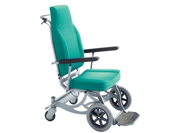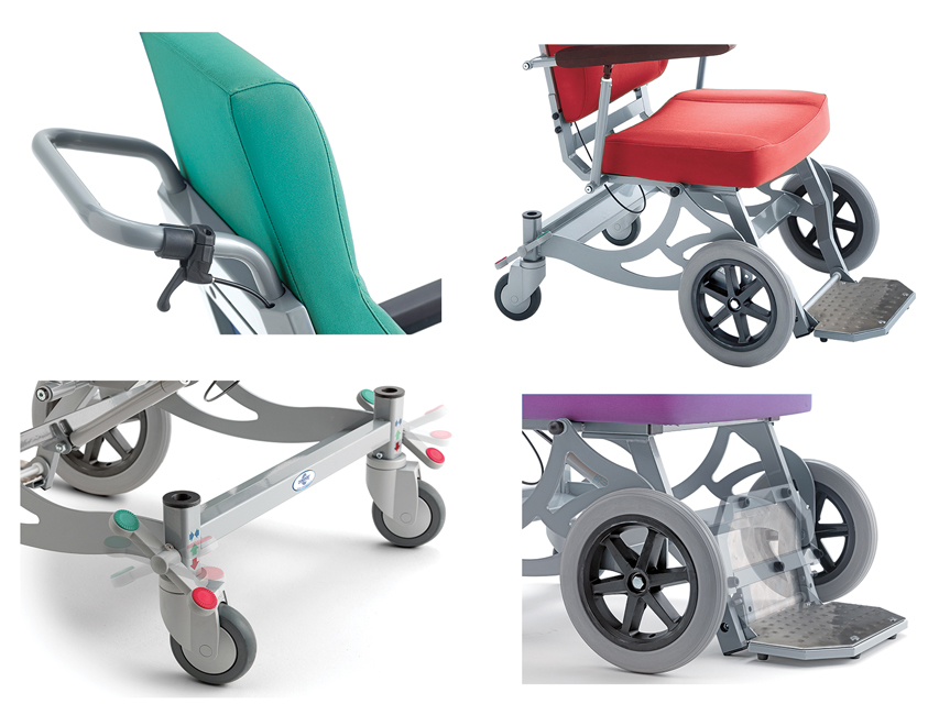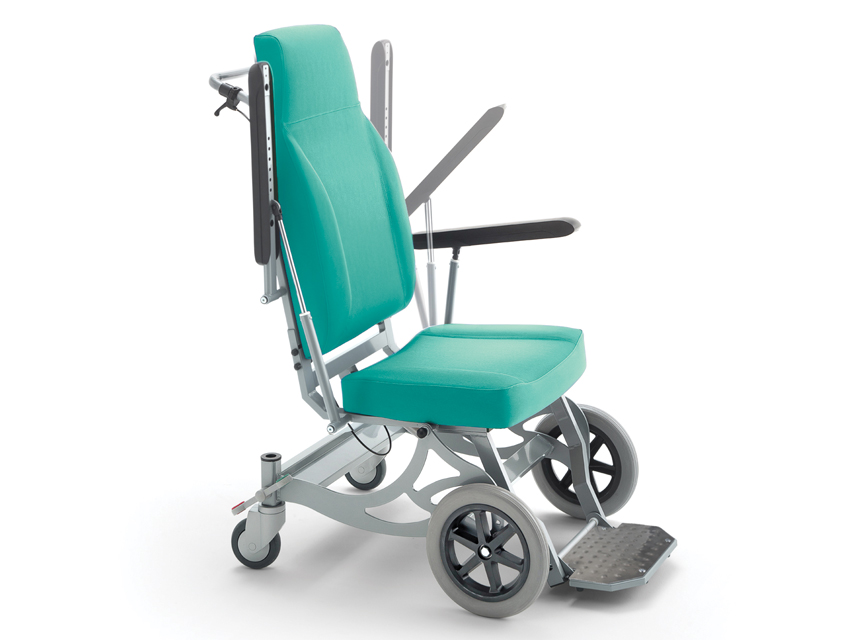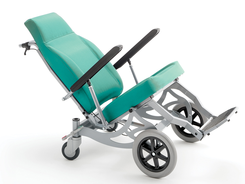 Sedia per il trasporto di pazienti all’interno di un ospedale o di una comunità; adatta per i trasferimenti in pronto soccorso o nei reparti. Idonea anche per trasferimenti esterni, per superare ostacoli o per spostarsi su terreni irregolari. Ruote anteriori solide con diametro di 30 cm e 2 rotelle piroettanti posteriori con diametro di 12,5 cm. La sedia può essere spostata facilmente anche con il paziente seduto e anche in spazi estremamente ristretti. Con il poggia-piedi abbassato fino a terra e lo schienale rialzato, il paziente può svolgere in tutta sicurezza qualsiasi attività, da seduto o in piedi. I braccioli possono essere sollevati per consentire l’accesso laterale. Lo schienale può essere reclinato mediante una molla a gas, creando un’inclinazione del sedile (-33°/+6°) che consente una posizione più comoda per riposare e rilassarsi. Dotata di maniglia di spinta, tasca posteriore e pedale per l’attivazione di un “sistema di frenaggio centrale” e di un “sistema di blocco direzione” sulle due ruote posteriori. Portata max 160 kg. Ignifugo Classe I M.