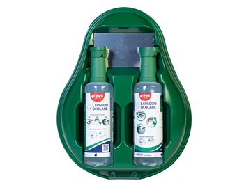 Contiene, in un kit termoformato da muro tutti i componenti necessari per un efficace lavaggio oculare di primo soccorso: