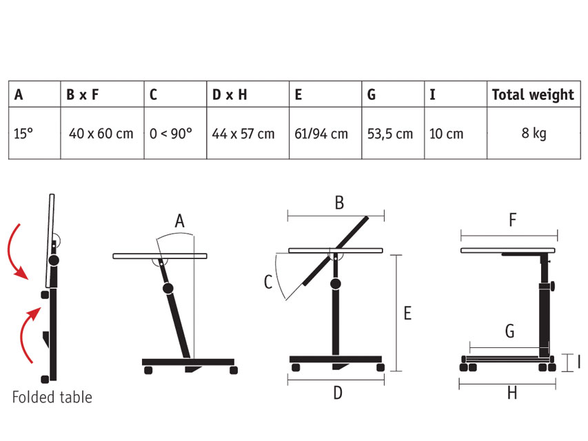 Piano di appoggio di alta qualità, laminato e ignifugo, con listello di bordatura. Struttura a forma di “C” in acciaio verniciato a polvere epossidica per un maggiore avvicinamento della sedia. Fornito pronto per l’uso, può essere facilmente ripiegato e riposto in uno spazio ristretto (15 cm).