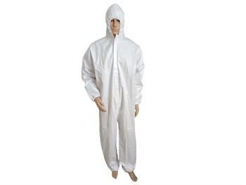 Tute in tessuto non tessuto microporoso traspirante, con cappuccio, polsini elastici, elastico in vita, cerniera frontale.
